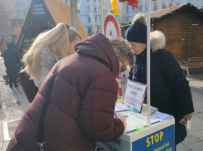 Na pěší zóně v Pardubicích na Přihrádku v blízkosti místního zámku se 6. prosince 2025, druhou adventní sobotu, sešlo jedenáct praktikujících Falun Gongu z Čech i Slovenska, aby sbírali podpisy na petici za lidská práva učedníků Dafa, kteří jsou v Číně pronásledováni a vězněni čínským režimem. Během dopoledne i přes poledne se u petičního stolku často zastavovali lidé, kteří mířili na vánoční trhy anebo na zámek. -