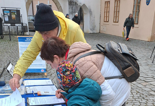 Na pěší zóně v Pardubicích na Přihrádku v blízkosti místního zámku se 6. prosince 2025, druhou adventní sobotu, sešlo jedenáct praktikujících Falun Gongu z Čech i Slovenska, aby sbírali podpisy na petici za lidská práva učedníků Dafa, kteří jsou v Číně pronásledováni a vězněni čínským režimem. Během dopoledne i přes poledne se u petičního stolku často zastavovali lidé, kteří mířili na vánoční trhy anebo na zámek. -