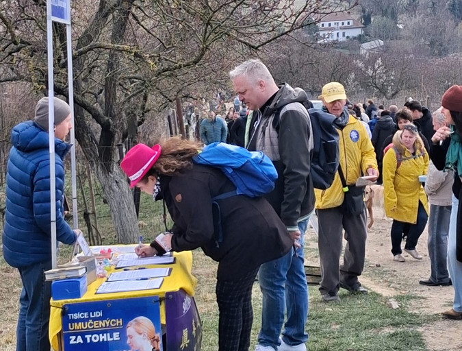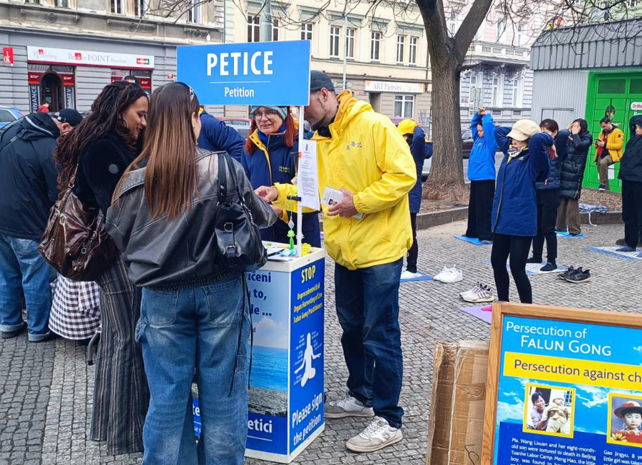 V sobotu 21. března 2026 uspořádali praktikující Falun Gongu petiční akci u Letenského náměstí. Okolo petičního stolku proudily davy lidí mířících na protestní shromáždění. Pozorně si četli informace z bannerů o nedobrovolném odebírání orgánů praktikujícím v Číně. Se soucitem a ochotně podepisovali petiční archy a na oplátku si brali lotosové kvítky, za které ze srdce a s úsměvem děkovali. Okolo také projížděly alegorické vozy. -